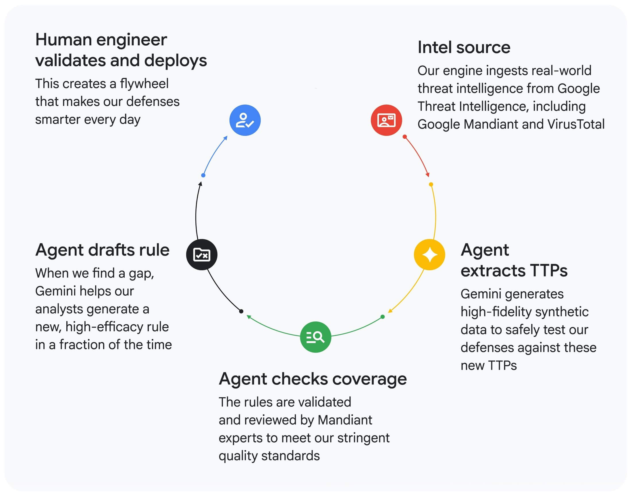 Khi đối mặt với lỗ hổng zero-day, các chuyên gia có thể bỏ qua bước đối chiếu thủ công để tiếp cận ngay các thông tin chiến dịch và chỉ số xâm nhập (IoC) đã được cá nhân hóa cho doanh nghiệp. Điều này cho phép doanh nghiệp chủ động ngăn chặn rủi ro trước khi sự cố xảy ra. Nhờ Gemini in Security Operations: giải pháp liên tục thu thập dữ liệu tình báo để testing hệ thống, tự động phát hiện lỗ hổng bảo mật và đề xuất quy tắc ngăn chặn mới. Quy trình tự động hóa này đảm bảo doanh nghiệp luôn được bảo vệ tức thì trước các mối đe dọa mới nhất