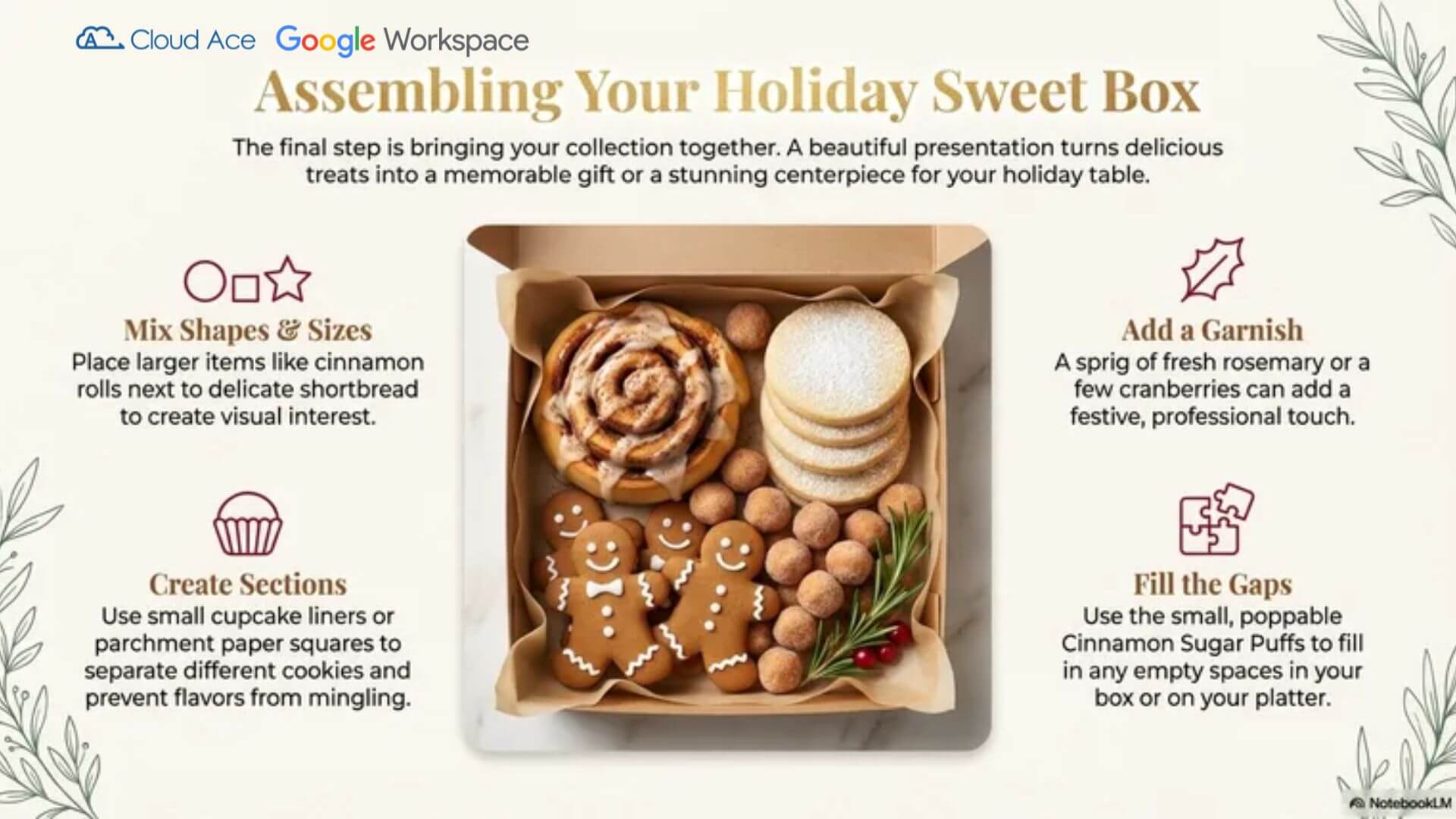 Prompt: Holiday themed overview of all the sweets baked from the pictures. Reference the recipe from the note.