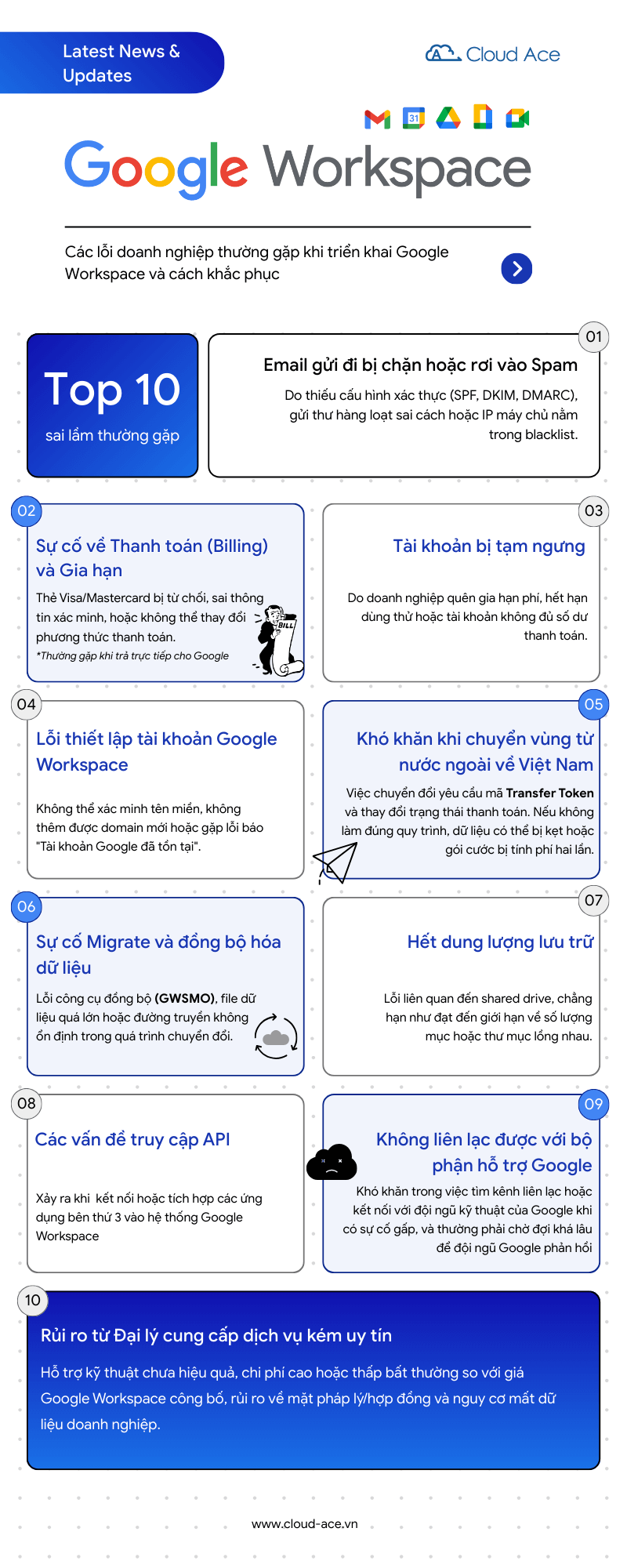 Triển khai Google Workspace không đơn thuần là thiết lập tài khoản, mà là một quy trình chuyển đổi số đòi hỏi sự chính xác tuyệt đối về kỹ thuật. Thực tế cho thấy, rất nhiều doanh nghiệp gặp bế tắc ngay từ khâu đầu với lỗi xác minh tên miền, thất bại trong việc đồng bộ hóa dữ liệu (Migrate), hay gặp khó khăn phức tạp khi muốn chuyển vùng từ nước ngoài về Việt Nam. Nếu không được xử lý đúng quy trình, các lỗi này có thể dẫn đến việc dữ liệu bị kẹt, chi phí bị tính hai lần hoặc giới hạn lưu trữ không mong muốn. Dưới đây là bảng tổng hợp các sự cố kỹ thuật điển hình. Hãy cùng Cloud Ace tìm hiểu nhé.